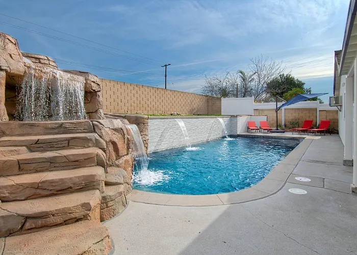 De gesitueerde in Anaheim F-64 California Vibes Villa Anaheim is binnen 25 minuten loopafstand van Disneyland Park gelegen en biedt een verwarmd zwembad, wat zorgt voor een ontspannen verblijf.